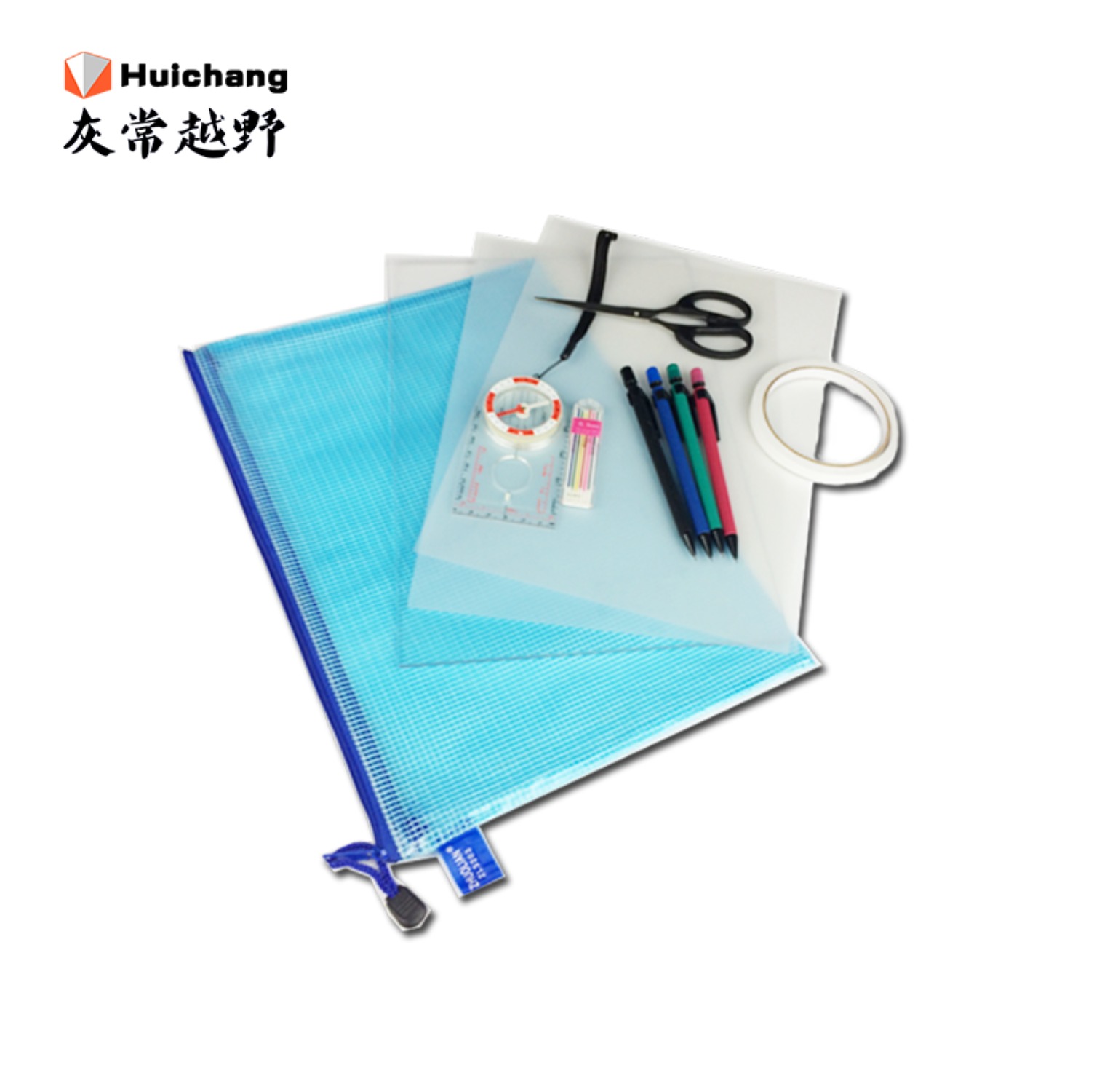 包含:制图袋1,制图板1,制图膜2,制图笔4,彩色笔芯1,剪刀1,双面胶1,橡皮1,610指北针1
